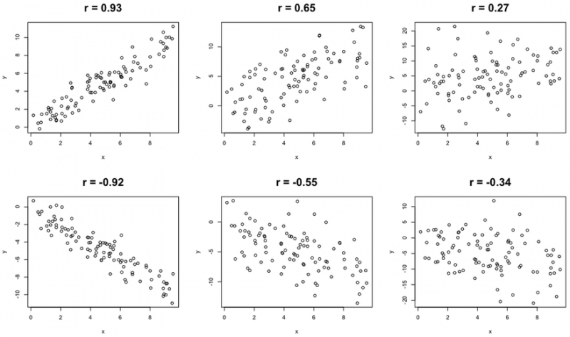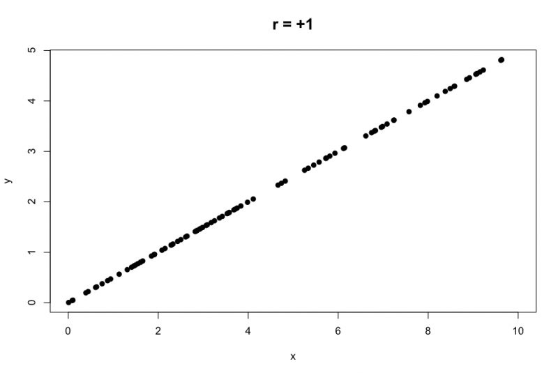 | If r = +1, we say X and Y are perfectly positively correlated, and all of the points would form a straight line. | If r = −1, we say X and Y are perfectly negatively correlated, and all of the points would form a straight line. |