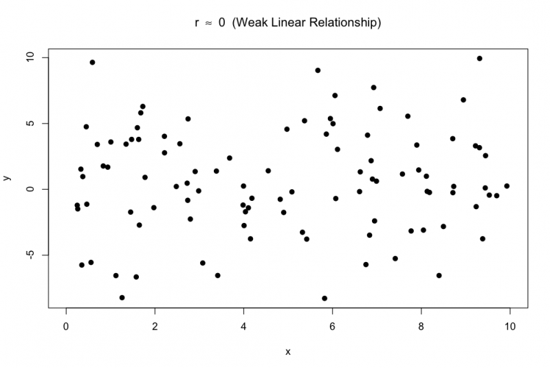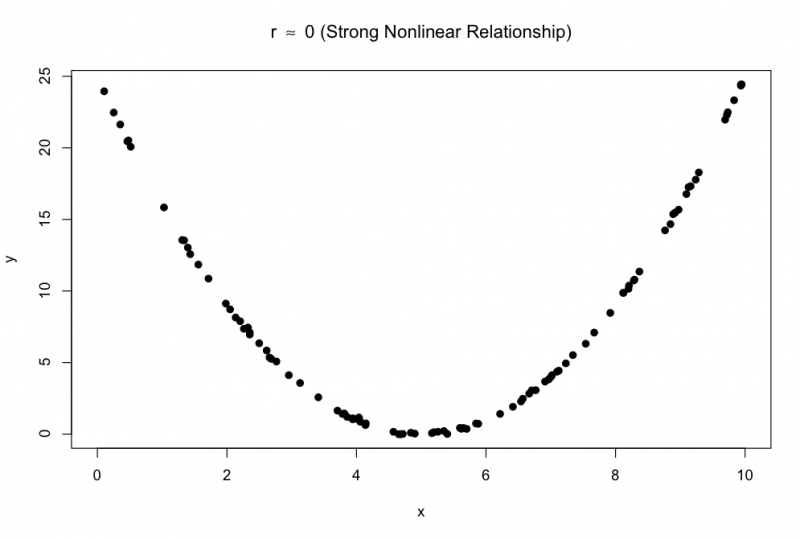 | Reason 1: There is weak linear relationship between the variables. | Reason 2: There is a strong relationship between the two variables, but the strong relationship may be nonlinear. |